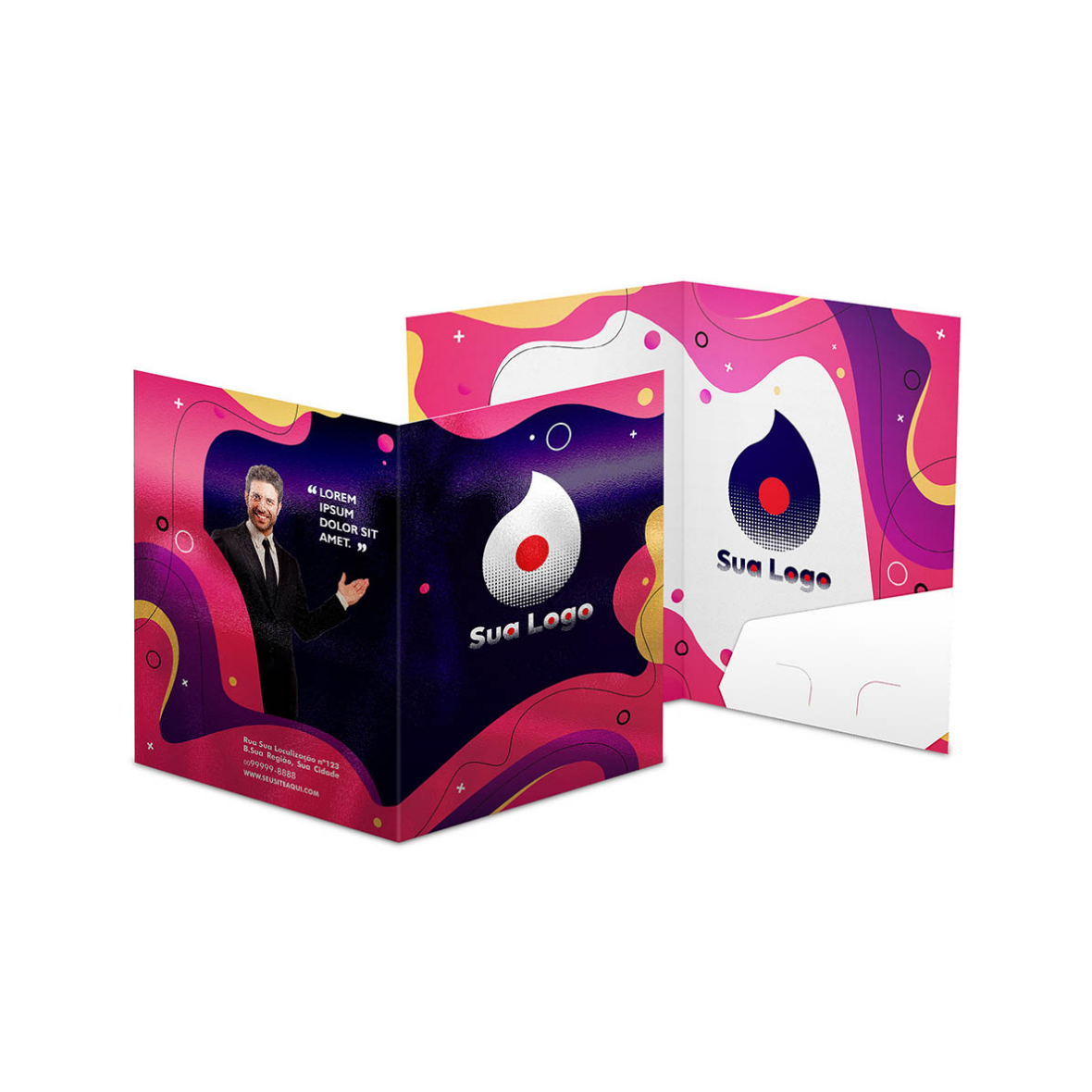 Pasta executiva com bolsa interna colada, produzida em papel Couchê 300g de alta qualidade. Impressão colorida 4x4, acabamento com Verniz UV Total na frente e tamanho final de 440x310mm. Perfeita para apresentações profissionais.